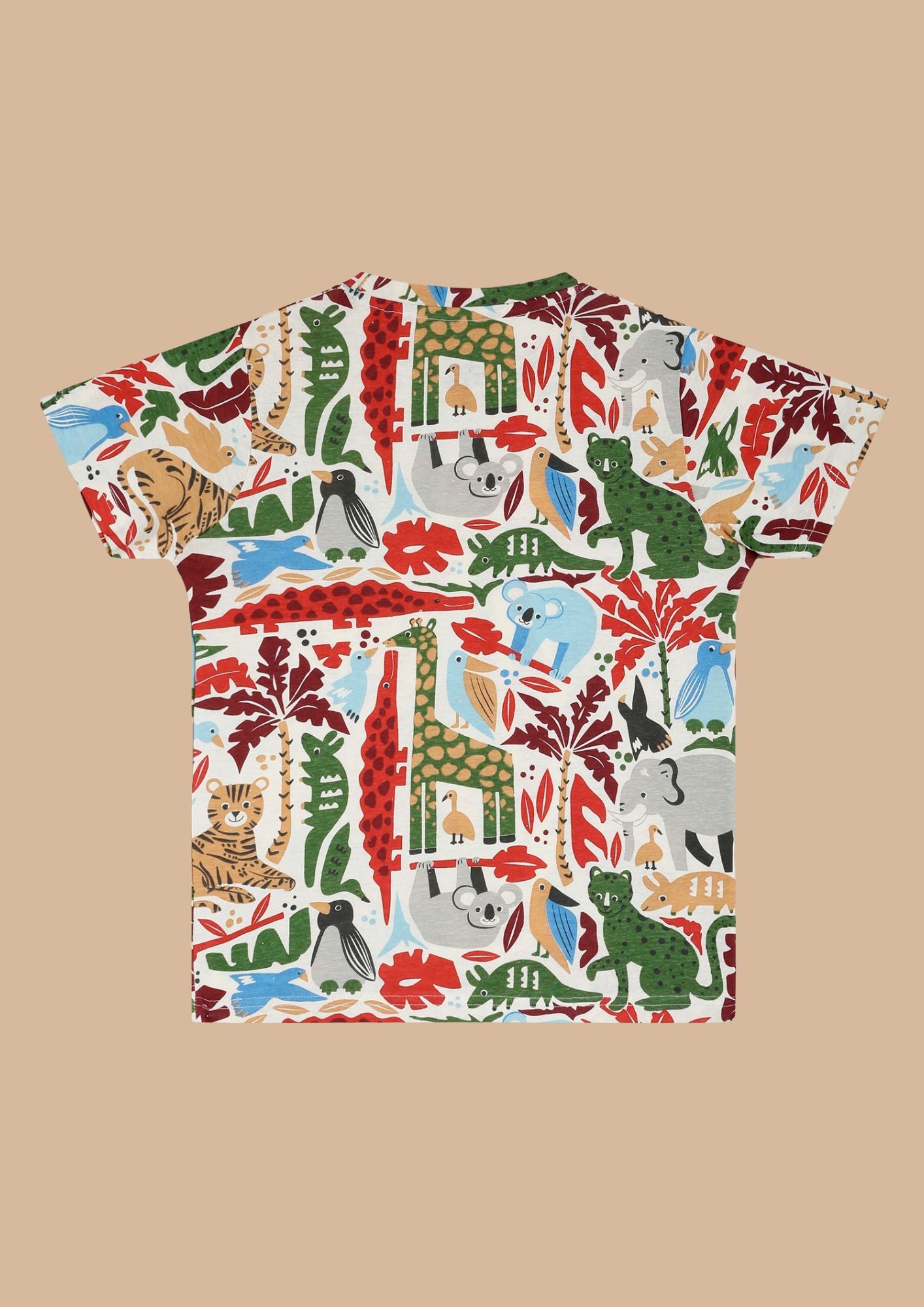Bring playful energy to your child’s wardrobe with the CHILINS kids’ animal print shirt and Pyjama set, crafted from 100% pure cotton for breathable comfort. Featuring vibrant illustrations of giraffes, elephants, birds, and tropical foliage, this cheerful outfit is perfect for camping trips, outdoor adventures, or casual summer days. The lightweight cotton fabric ensures softness against the skin, keeping kids cool and comfortable while they explore and play.