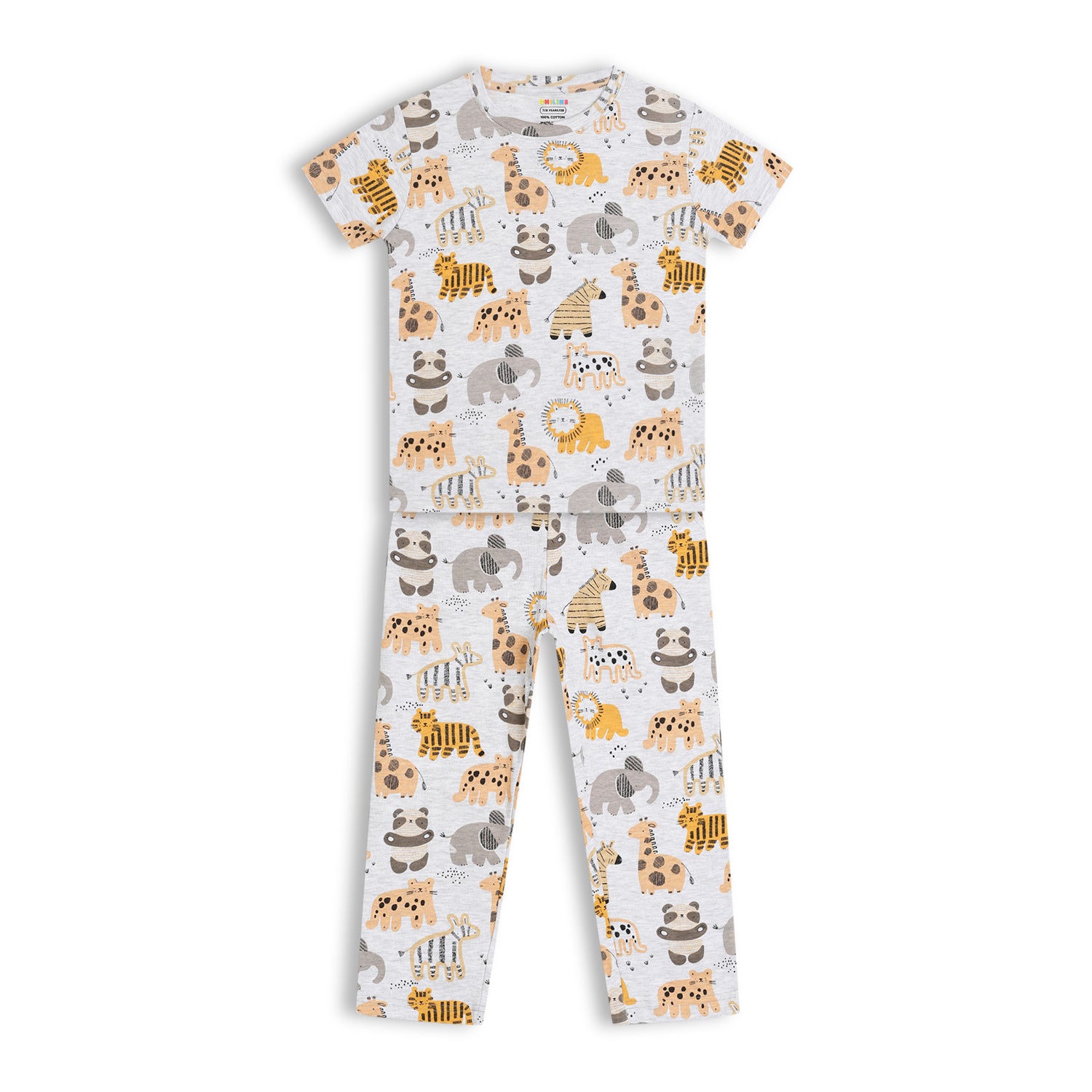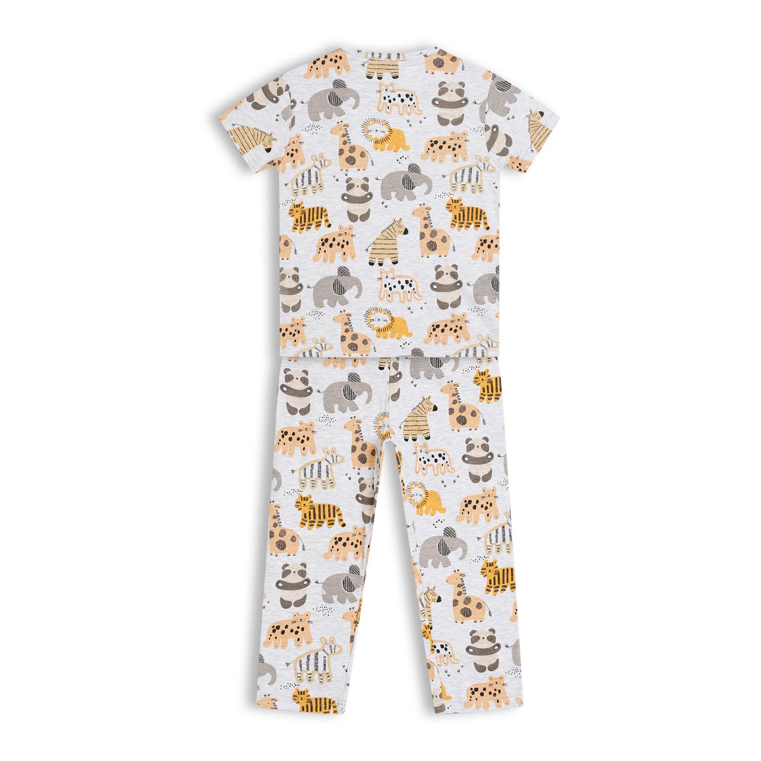 The short-sleeve t-shirt pairs perfectly with matching full-length pyjama pants, both adorned with adorable animal prints that kids love. Whether used as nightwear, sleepwear, or comfortable home wear, this set ensures freedom of movement and all-day ease.